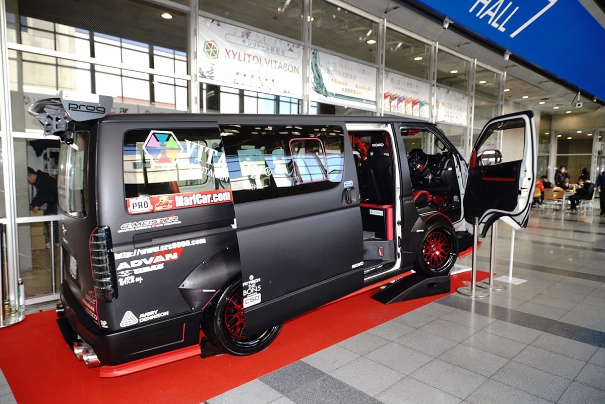 会場となった幕張メッセの2F通路に展示され、大勢の来場者が足を止めて見入ったこのマシン。一見はレーシーに仕立てられたトヨタ・ハイエースなんだけど、その心臓部が凄いことになっていた!