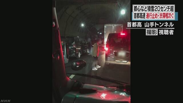 首都高速道路では、大雪の影響で22日夜から各地で通行止めや渋滞が相次いでいます。このうち、中央環状線の地下にある山手トンネルでは、長時間、激しい渋滞が続いたため車を降りて歩いて非常階段を上り地上に出る人たちが相次ぐ事態となりました。