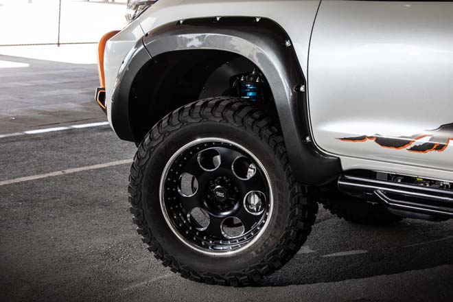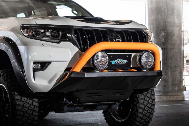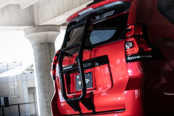 リアラダーやトレイルヒッチはオフロード感を高めるアイテム。同時に4本出しマフラーを追加することで上品さも併せ持つ。