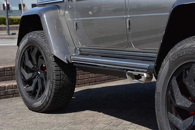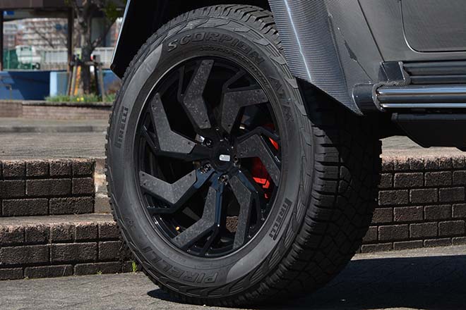ホイールはモノブロックのJCWデザイン(22インチ:9/9.5/10/10.5J インセット0~45)。230mmワイドのドライカーボンフェンダーでツライチを生み出すのはポータルアクスルの賜物である。