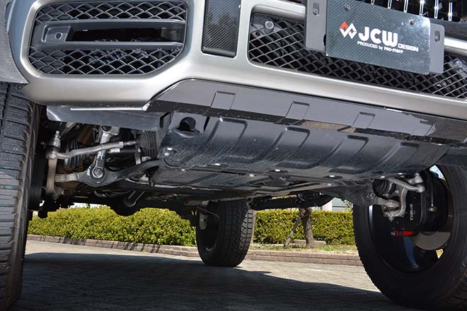 特筆すべきはそのリフトアップ手法である。従来なら位置関係の変更によってプロペラシャフトの角度補正や、ステアリングダンパーの変更およびラテラルロッドをはじめとする各パーツが盛り込まれるものだが、ボディアンダーはスッキリした印象。足回りを除くと、ごく一般的な上げ幅の40mmUPコイルに留まる。そのカラクリが肝となるポータルアクスルだ。