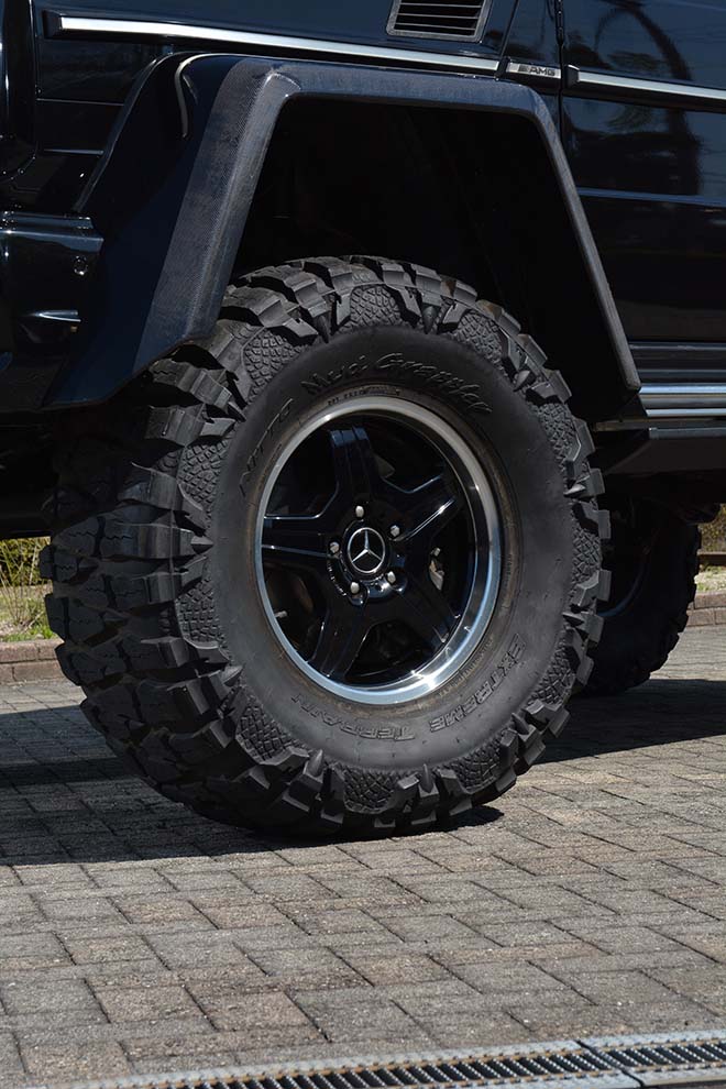 本来ならホイールハブから一直線に並ぶはずのドライブシャフトがホイールハブをストックしたまま5インチほど上方向へスライド。純正の足回りのままで約125㎜もの上げ幅を稼ぐことに成功したのだ。利点はそれだけではない。ハブリダクションシステムの追加によってドライブシャフトとホイールハブの間に組み込む両側のTIBUSがワイドトレッド化を生み出し、本来ならリムの深いホイールかスペーサーを使用てオーバーフェンダーの出幅に合わせていく作業が不要に。さらにはデフの位置関係が上がる事で最低地上高を効率よく確保。美しくリフトアップするうえで理想形と言える手法は、G63のキャラクターと絶妙にマッチする。