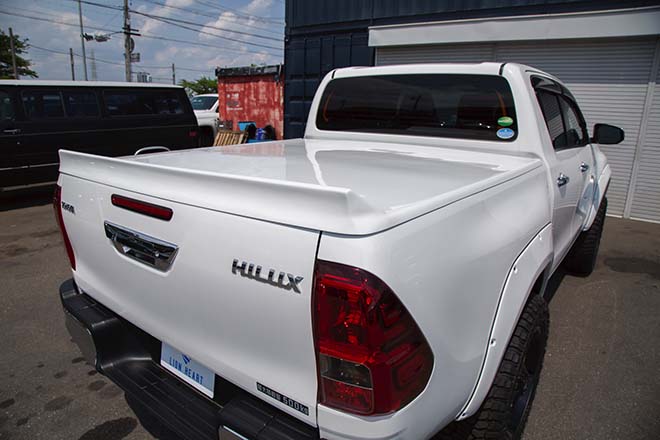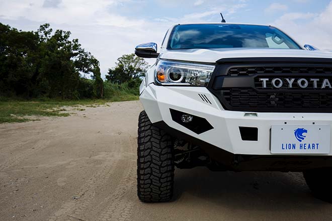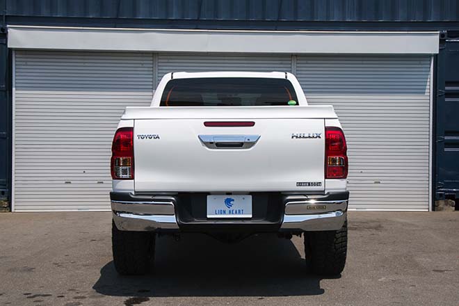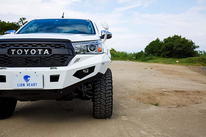 ちなみにこのオーバーフェンダーはストックのフェンダーにピタリと寄り添う形状ながら、よりワイルドな雰囲気を演出するフロントバンパーとの併用も可能。好みに合わせた演出の可能性の広さは有り難いところだ。「ライオンハート」では継続してハイラックスに力を入れていくということで、すでにハードトノカバーもリリース済み。車両販売からのカスタムも可能とあって、この夏に向けたアクティビティ用に、コンプリート・オーダーをしてみてはいかがだろう。