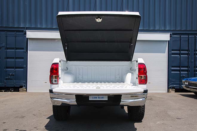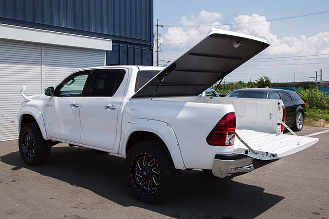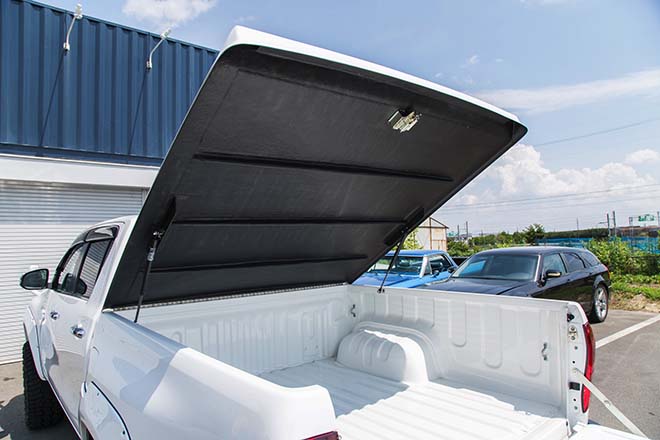 搭載物の保護やセキュリティ面でも装着したいハードトノカバーはスタイリッシュなテールエンドが特徴のエアロデザイン。ガスダンパーによる跳ね上げ式で開閉もスムースな作り。