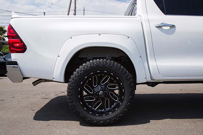 餅は餅屋、というべきか。「ライオンハート」が自信を持って送り出すハイラックス用オーバーフェンダーキットは、日本のオバフェン文化を世界に誇るジャパニーズ・カスタムカルチャーへと昇華させた「リバティーウォーク」に開発を依頼したもの。製作されたデモ車両は、さすがの存在感を漂わせて撮影現場に現れた。「ライオンハート」は、JEEPラングラーや各種USモデルのカスタムと販売を手掛けるが、その経験値やセンスと、リバティーウォークのプロデュース能力がコラボしたと聞けば、その出来栄えも当然といえば当然、なのかも知れない。