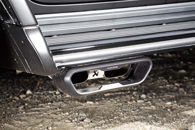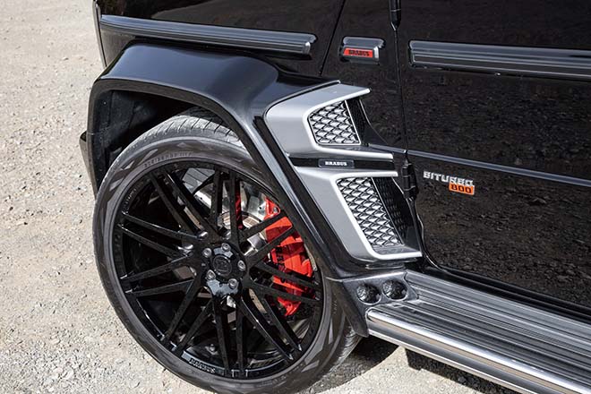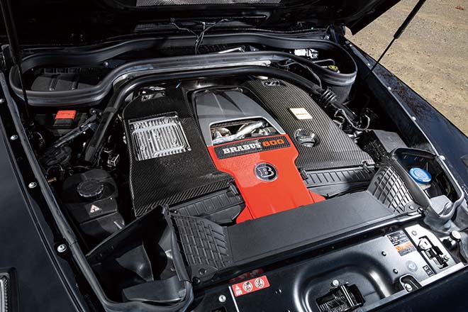アルミホイールはBRABUSのモノブロックF(11.0J×23)。車高はローダウンスプリングで若干落とされている。エキゾーストは純正バルブを移植したブラバスの左右4本出しで、ノーマルの排気バルブスイッチがそのまま使用できる。