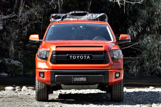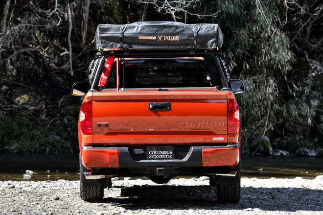 2015年モデルのトヨタ・タンドラ。現在、新車には用意されていない鮮やかなボディカラー、インフェルノがテントのロゴとマッチ。