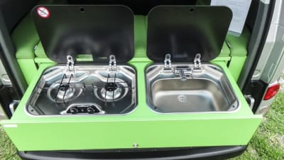 リアに搭載するボックスの中には、シンクとガスレンジを搭載。引き出して蓋を開けるとこの通り!