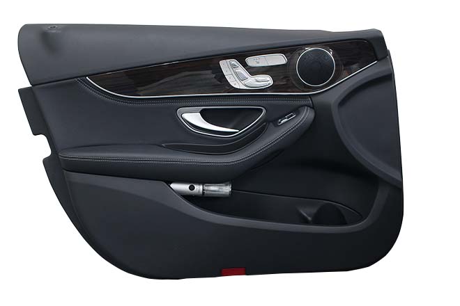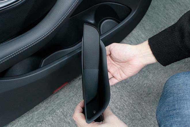 これはGクラス用ではないのだが、W205型Cクラスに対応したドアストレージボックス。アームの貫通部分を収納スペースにするもので、こちらもあると便利なアイテムのひろつ。非常灯もすっきりと収納できる構造になっており、中敷も純正デザインに近いシリコンラバーを採用する。