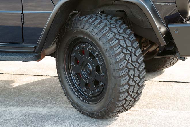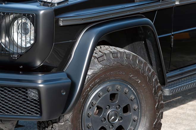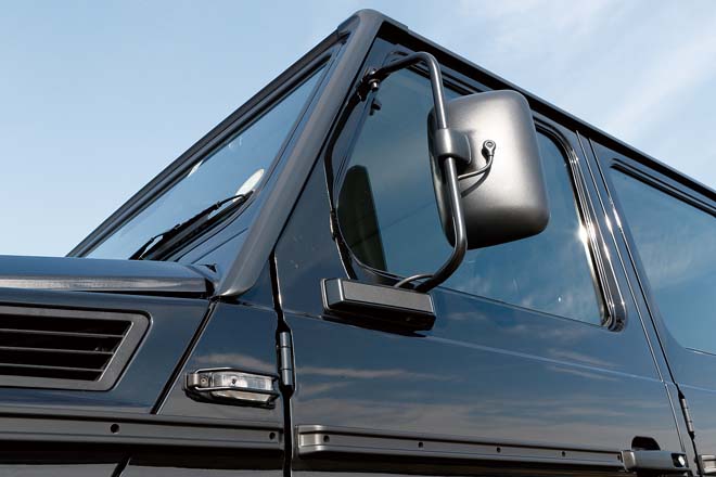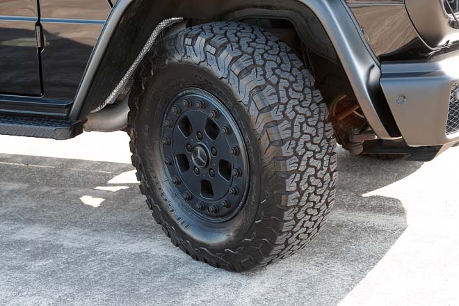G500時代の純正フェンダーや、W460用のネジ止めサイドモールに変更。ホイールはミストラルのBLS16(7J×16 , +63)にBFグッドリッチAT K02(265・75R16)をセット。プロフェッショナル純正ミラーはブラインドスポットアシストにも対応し、ヒーテッド機能や電動調整も可能。フェンダーに合わせて細身のサイドステップも装着する。