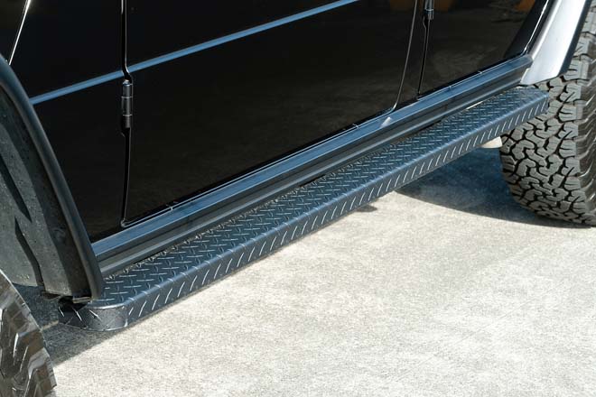 GWFのスプリングとKONIのビッグショックで2インチリフトアップ。463インダストリーズのホイールに、GRABBERの295/55R20をセット。スチールのサイドステップにも変更し、ヘビーデューティさを強調。リヤラダーはORCとなる。
