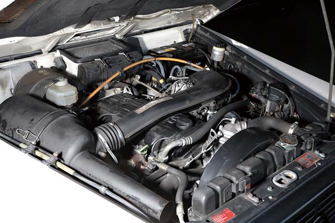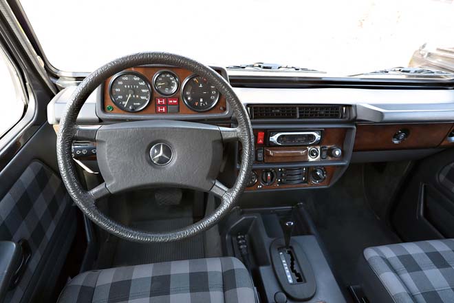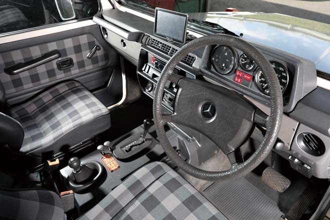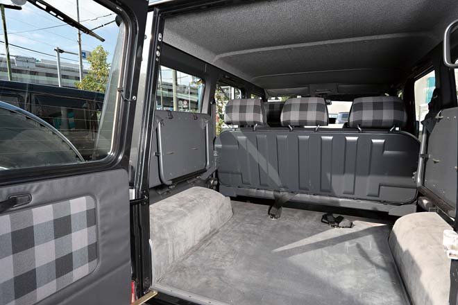 W460の230GEは軍用車らしいシンプルな作りが魅力だが、メルセデスらしい豪華な装備を付けたプレディカートも存在する。創業当時からこのプレディカートも積極的に販売してきたワンオーナーだけに、こういったモデルを予約販売することも可能。撮影車両はオーナー車両だが、グリルガード、サイドデカールの付いたロングボディの5ドアモデルだ。