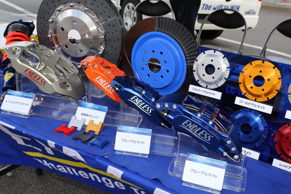 当日は、他にも、同じくブレーキ系パーツで有名な「エンドレス」では、ブルーアルマイトや高耐熱オレンジなどカラフルなブレーキキャリパーなどを展示。