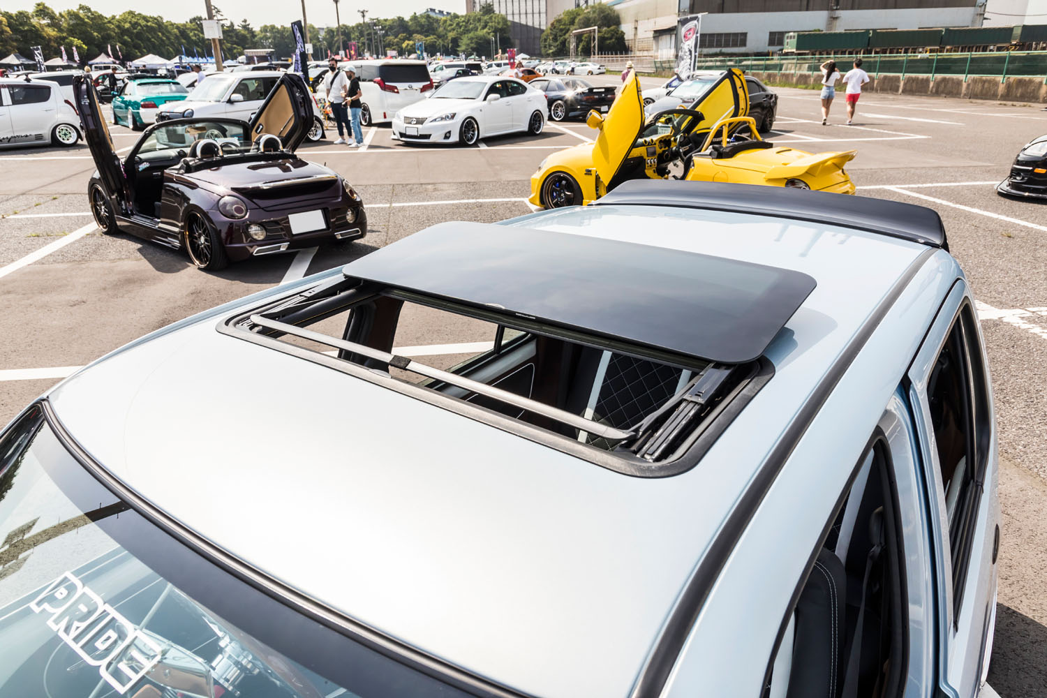 HotSpringsの会場にはWORKホイールを装着した大小さまざまなカスタムが集結したが、数多く集まったカスタムのなかに一見すると純正風ながら不思議なオーラを放つエッセを発見。オーナーの大湖さんにお話を聞くと、じつはかなり細かい部分まで手が入った大技満載の渾身の1台だった。