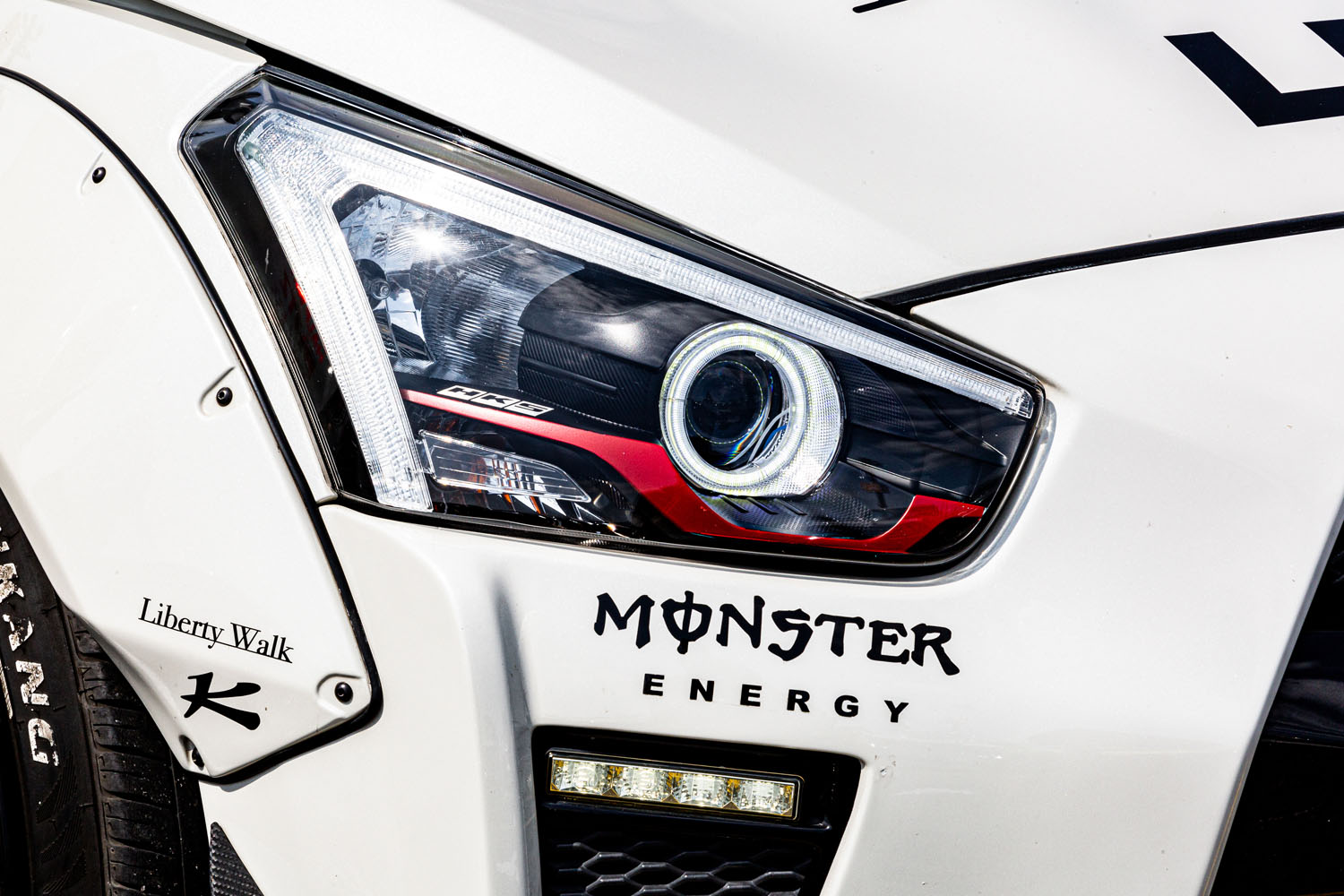 「外装的なところではGT-Rをあまり崩さないようにしています。でもやっぱり個性は出したいなと思っていたので、自分でやって他と被らないようにしています。リップはリバティーのものではなく通販で手に入た汎用品を位置決めして装着、ヘッドライトは殻割りしてGRタイプに黒塗りして赤のアイラインを入れてHKSのステッカーを貼って。あと最近はステアリングをモモ製に替えたり、ボンネットにスペーサーを入れて浮かせてます。これは格好よくなるかなということで」