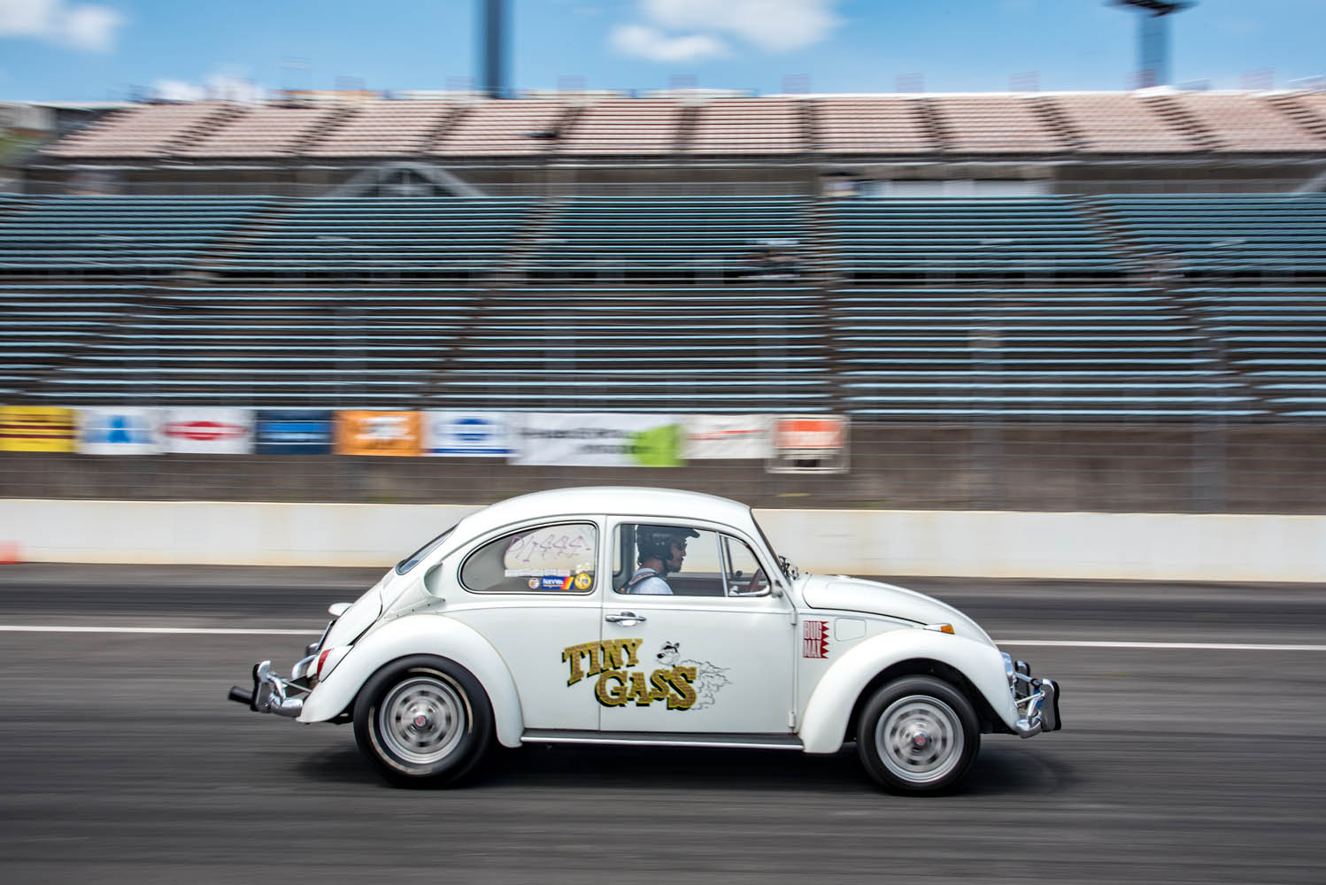 ドラッグレースへの挑戦は、2014年、今の愛車の前の1963年式ビートルで仙台ハイランドのジャパンドラッグレースウェイまで自走して参加したのが始まりとなる。