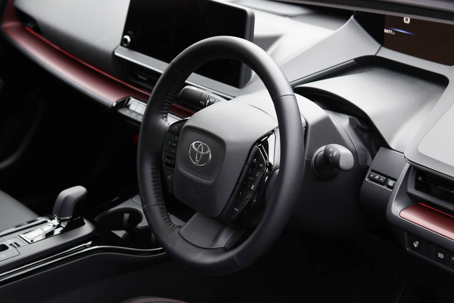 インテリアも「攻め」を感じるデザイン。トップマウントメーターから伸びやかに配置されたステアリングは、なんだか未来を感じる雰囲気に仕上がっています。「bZ4X」のデビュー時はメーターの視認性に難があると言われていたトップマウントメーターですが、プリウスではシートポジションとの位置関係が改善されたのか、不満を感じることはありませんでした。2023年に改良されたbZ4Xもメーターの視認性は向上しているかもしれません。プリウスのメーターを見てみると、視線の移動が少なく慣れてくるとこちらの方が快適と思ってしまうほど。メーターの在り方も過渡期にあるのかもしれません。