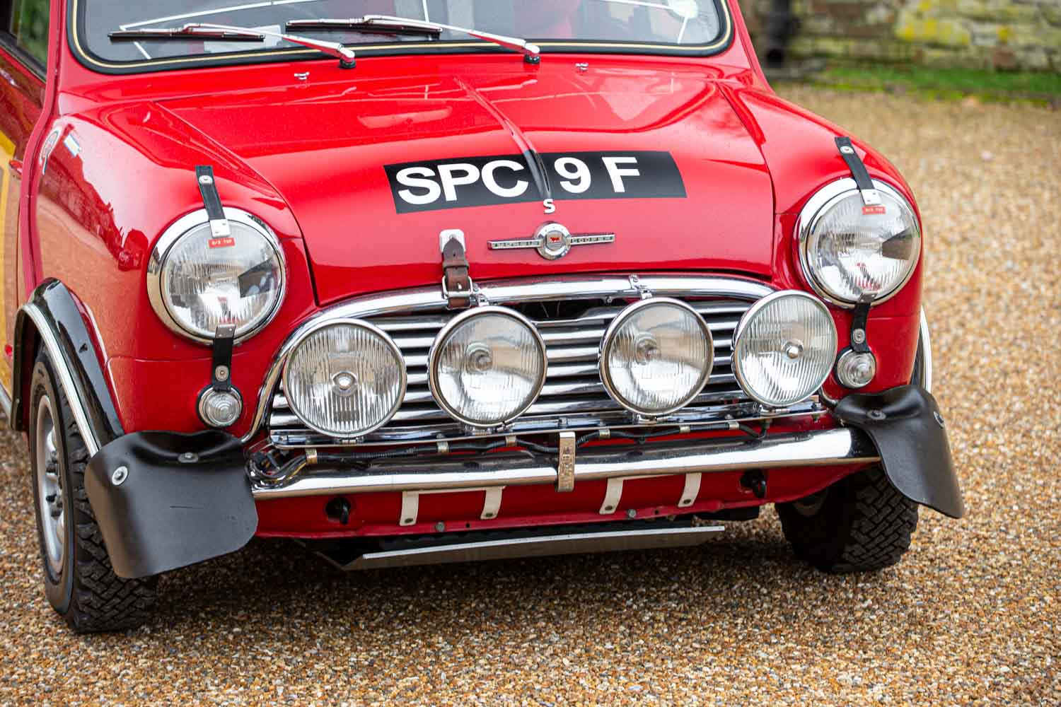そしてオリジナルと同じく、英ダンロップ社製のラリータイヤを「ミニライト」アロイホイールに組み合わせ、BMCワークスのオリジナルを正確にコピーしたルーフラックにスペアタイヤを載せている。