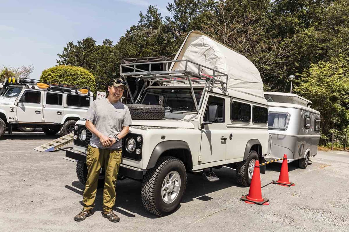 ランドローバー「ディフェンダー110ハードトップ」をベースに、英国ドアモービル社が架装したキャンピングカーに乗る渡邊さん。さらに、ディフェンダーでキャンピングトレーラーを牽引する姿は、ミーティング会場の中でも抜群の存在感を放っていました。巨大トレーラーを牽引するとなると、パワー的にも大丈夫なのか気になるところです。