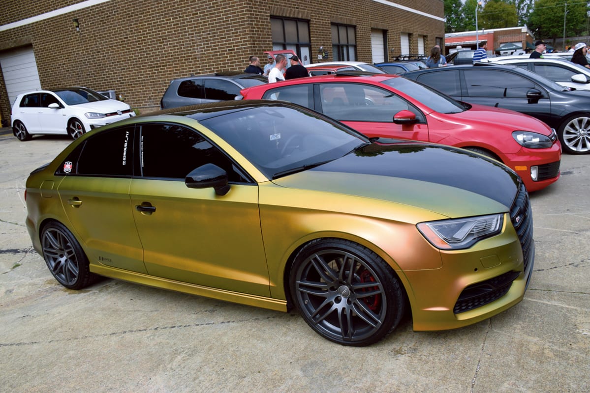 見る角度によって色が変化するマジョーラ風ラッピングを施したアウディS3。純正カラーのブラックを活かした張り込みです。