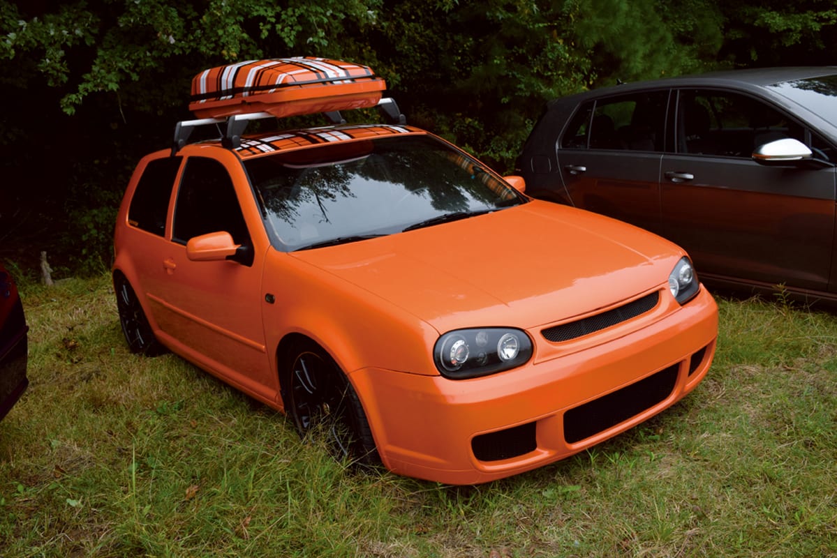 オレンジにオールペンしたゴルフ4。ジェットバッグも同色でペイントした上に、タータンチェック風にラッピング。