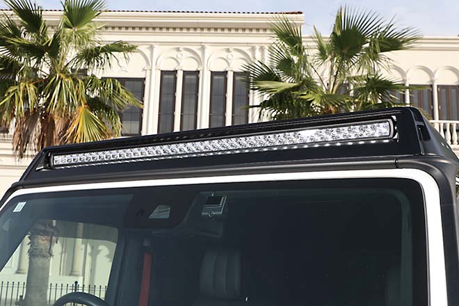 フロント回りにインパクトを与えるボンネットスクープカバー、フロントルーフにもLED付きのスポイラーを装着。フェンダーダクトパネルはABS製で、LEDとエンブレムが付属する。