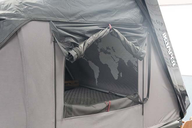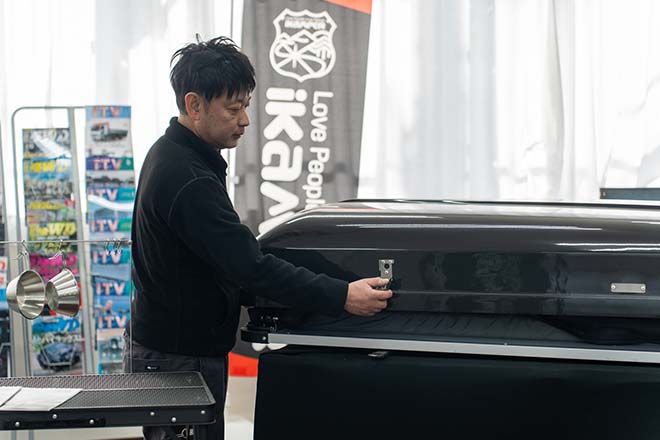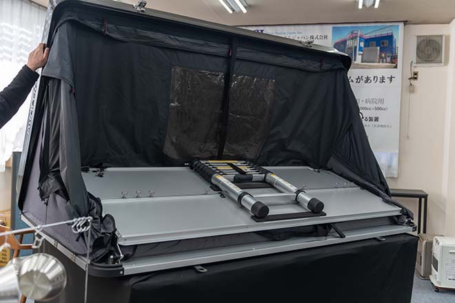 ルーフトップテントであるSKYCAMP3.0は1分程度でこのような状態で設営できる。大切な休日時間を有効的に使えるほか、機能性にも優れているのが魅力。
