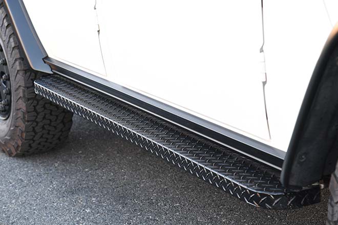 ボンネットの上に乗れる仕様であるウォーカブルボンネットをオマージュした粗目塗装を施す。本物と同じ間隔のリベッティング加工がなされているのもこだわりのポイント。その他にもサイドステップなどを装着する。
