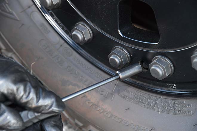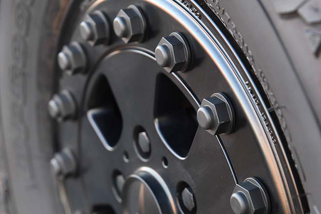 MMNDオリジナルとなる鍛造のBLS16ホイール。サイズは7J×16でインセットは+63となる。マッチングタイヤは、BFグッドリッチAT/KO2(265/75R16)を装着。ビードロック風なディスクの外周にナットデザインを16個配置。付属品には、バルブキャップと専用工具が付く。