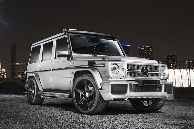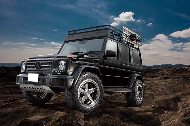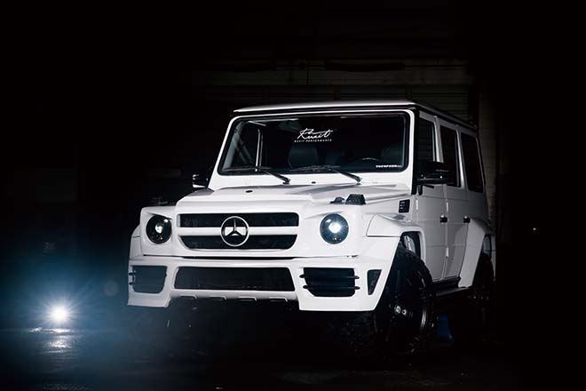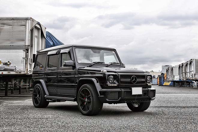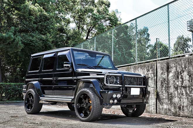 Gクラスの中ではスタンダードなグレードといえるG500をベースに、 G63にも負けない確かな存在感を与えるカスタマイズアプローチを示した1台。LEDデイライト付きヘッドライトカバーやG63用フロントリップ(LED付き)によってフロントマスクに新しさと迫力を与えることに成功している。さらにフロントルーフスポイラー(LED付き)を装着することで、他にはない個性も演出。サイドでは22インチのSAVINIのアルミホイールが注目ポイント。