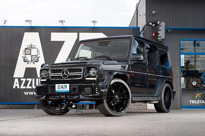 WALDのG63用フロントスポイラー&リアバンパースポイラーを装着し、ゴツさを強調しつつ、AZRのオリジナルブランドであるSKYPERFORMANCEの24インチで足元をスタイリッシュにまとめている1台。無骨すぎない、程よい大人っぽい仕上がりを見せ、AZRらしいセンスが発露した1台である。全体のシルエットを統合するローダウンの見事さや、左右4本出しマフラーについても、控えめな主張ながら全体のバランスを整えているように感じられる。