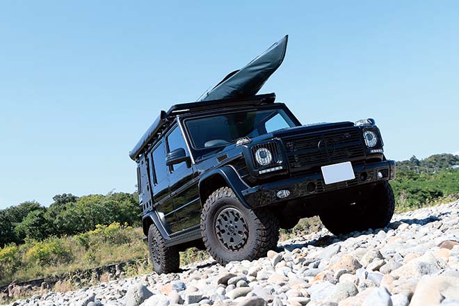 ワンオーナーが提案するカスタムは、キャンピングシーンが似合うアウトドアスタイル。ベース車両は2003年式のG500Lで、快適な装備はそのままに、前後バンパーやグリル、ライトベゼルをマッドグレイにペイント。これだけでクラシカルな雰囲気と個性的なフロントマスクが演出でき、ナイトシーンよりも清々しい青空の下が良く似合う。また、50mmリフトアップすることで、河原などでの安心感を向上。またルーフやスペアタイヤにラックを装着し、積載性や使い勝手を考慮。Gクラスの高い万能性をフルに活かしきるカスタムを随所に施している。