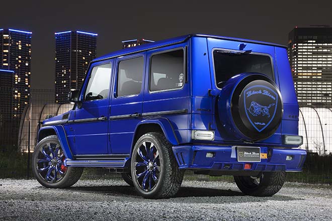 青い車両は、50周年記念アニバーサリーモデルのモーリシャスブルーよりも深く鮮やかな、コズミックブルーのフルラッピング仕様としたGクラス。フロントセクションで注目したいのは、マットブラックのグリルガードだ。前後左右のエアロはWALDのSPORTS LINE BLACK BISON EDISHONを装着。
