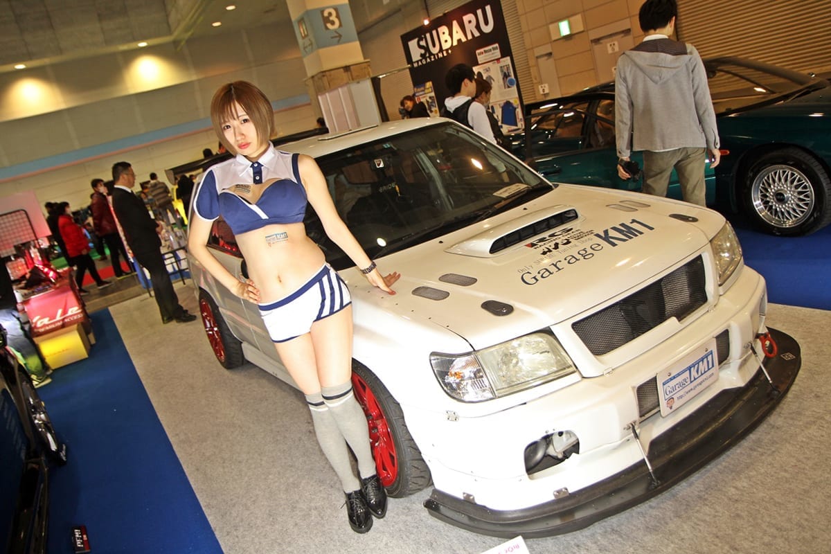 ブース内でS208を彷彿とさせる「クールグレーカーキ風ラバーディップ塗装」を纏った「レヴォーグ」を出展しているのは、関西の代表的なスバル車専門ショップとして支持されている「オートプロデュースA3」。本来設定のない6速マニュアルを搭載し、フロントマスクは同社の新作バンパー『AGRESS WRX TYPEフロントバンパー FACE2』を装着。