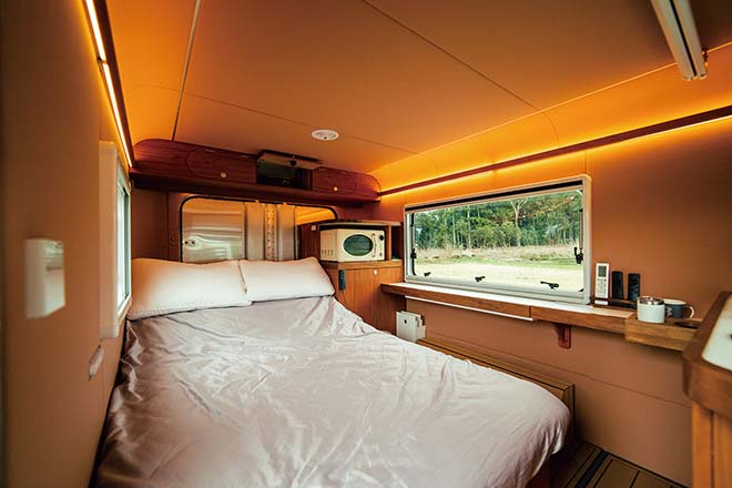 キャビン内は豪華客船のようなゴージャスな作り。ワクワクしながら中に入ってみると、見た目以上にゆったりできる空間となっているのだ。モデルによってキャビン内のイメージが異なるのも面白い。エアコンや水回り、キッチンまで完備しているので季節を気にすることなく、トレーラーライフを満喫できる。テーブルを収納してからのベッドへのアレンジも簡単にできるのも好印象で極上のひとときを過ごせる。