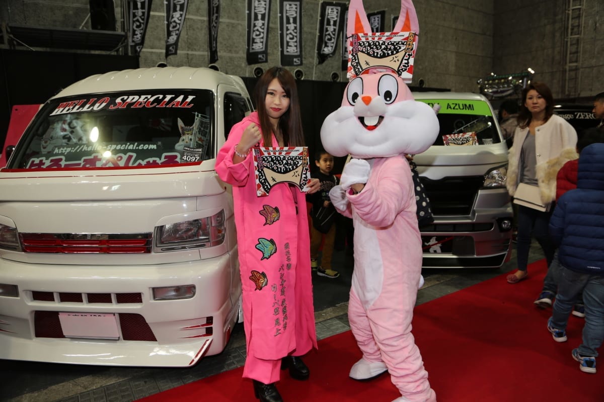 京都のパーツメーカー「はろーすぺしゃる」ブースに展示されたこのクルマは、ボディのほぼ全体をアルミパネルなどでフルカバードし、まるでアクセサリーやジュアリーのような彫金グラフィックを投入。