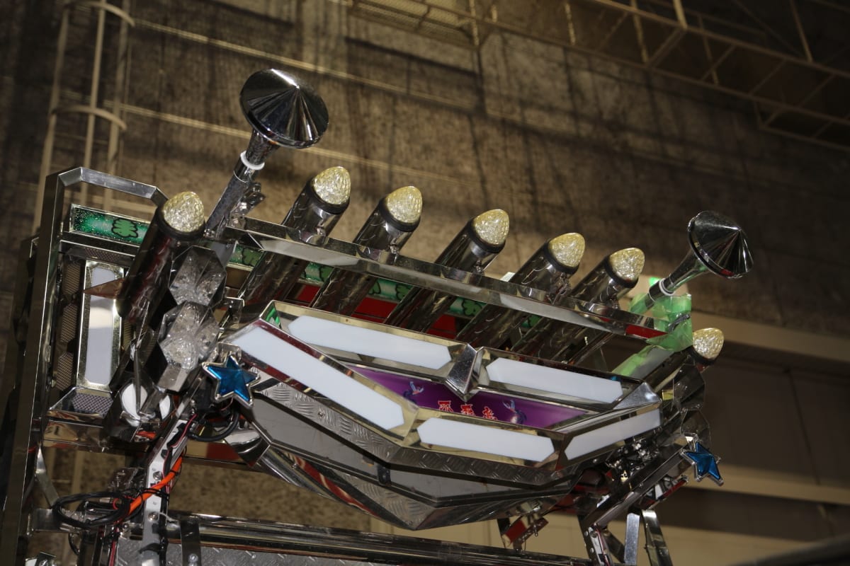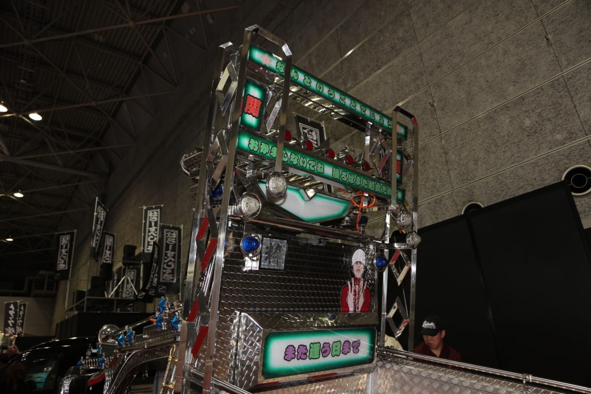 上空に突き上げるかのように伸び、光りモノパーツなどでドレスアップされた荷台前方のパネルなど、