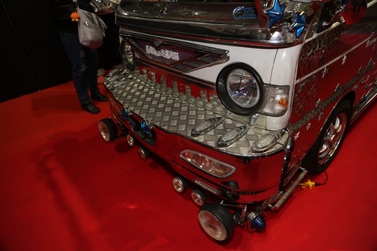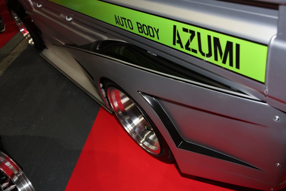 京都のパーツメーカー「はろーすぺしゃる」ブースに展示されたこのクルマは、ボディのほぼ全体をアルミパネルなどでフルカバードし、まるでアクセサリーやジュアリーのような彫金グラフィックを投入。