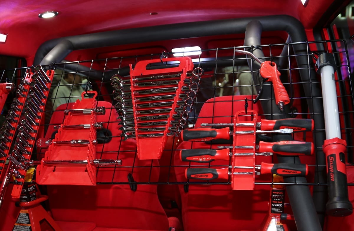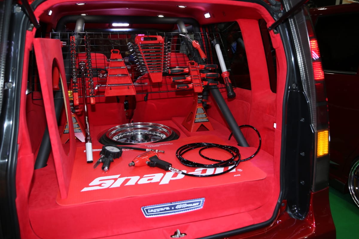 注目は、後部座席と荷台部分へきれいにデコレーションしたスナップオン製のツールたち。