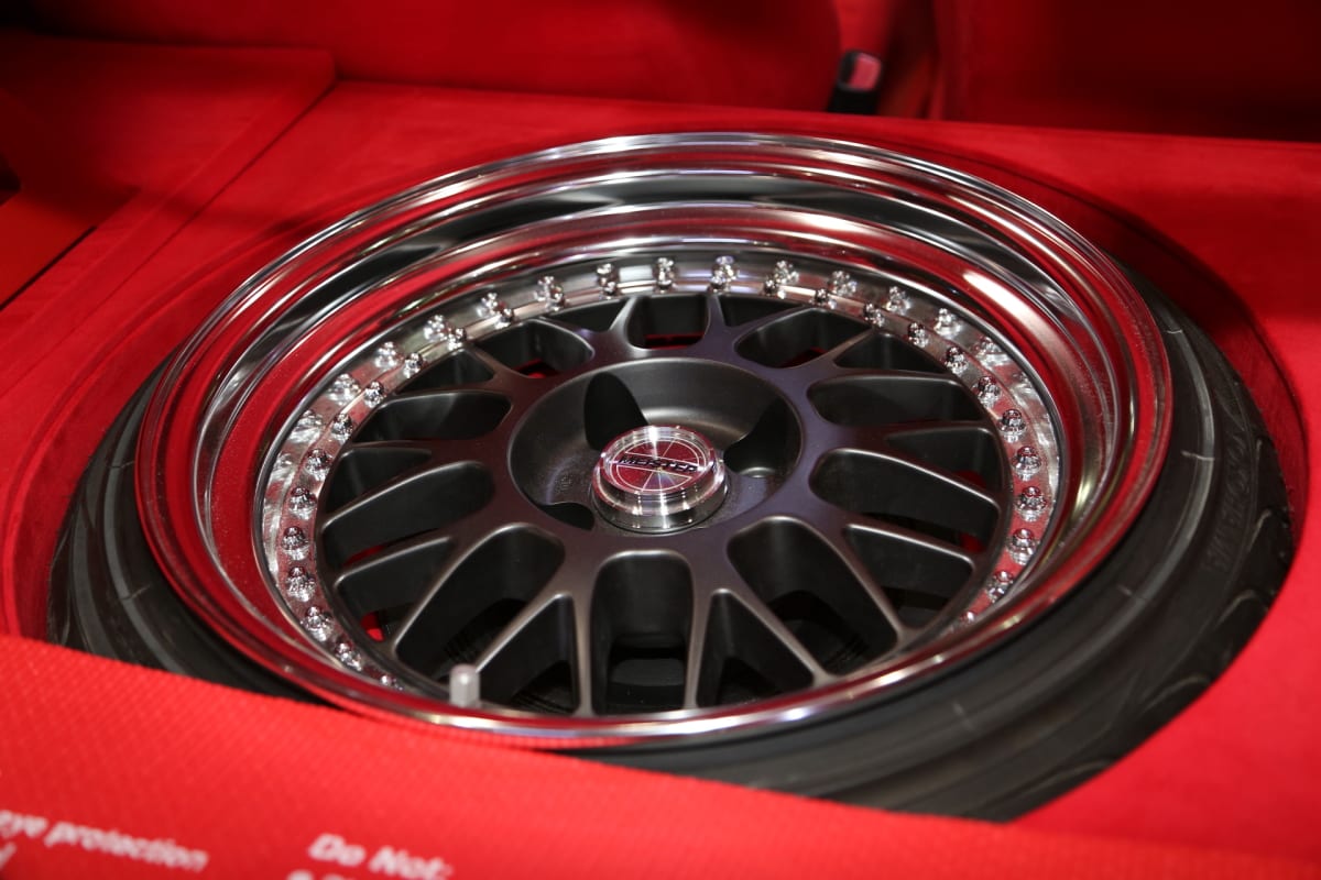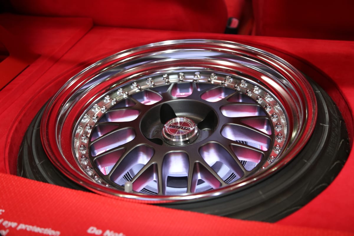 迫力満点のフルエアロやイデアル製エアサスによる圧巻のローフォルム。エッジが効いたエクステリアと相まって、こちらも魅せ技が満載の1台であった。
