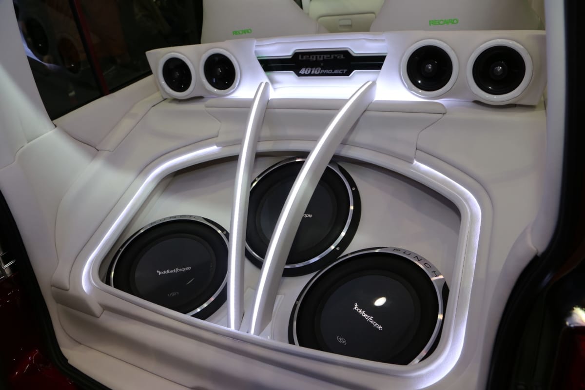 全体的に白を基調としたインテリアに合わせホワイトレザーをあしらったオーディオボックス内には、12インチのロックフォード製ウーファー3発などで、充実したサウンドを実現する。