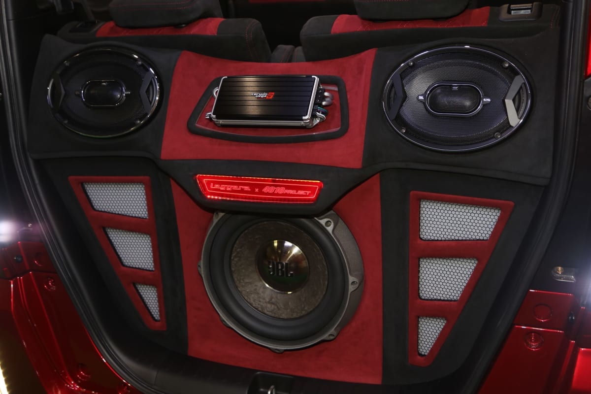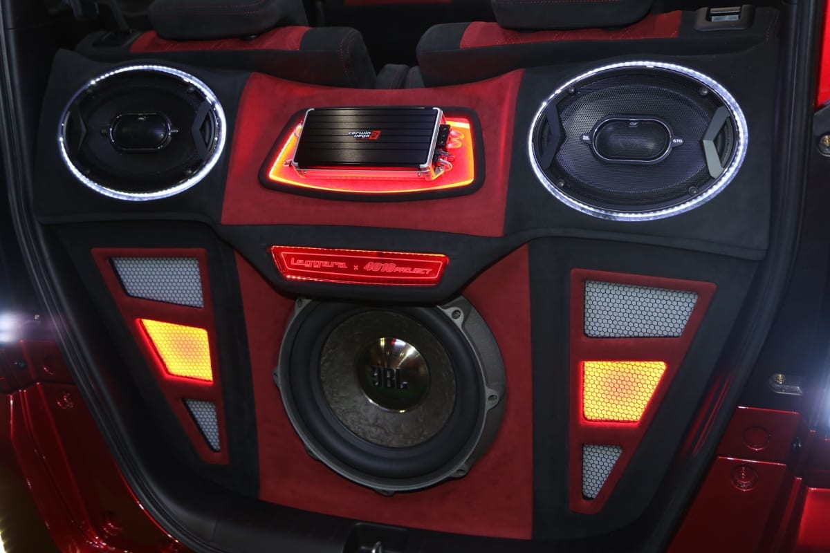 こちらは、普段の使い勝手も考慮して、荷台部分にのみオーディオをインストール。内装に合わせレッド×ブラックの色合いに統一されたオーディオボックスには、12インチのJBL製ウーファーなどを装備する。