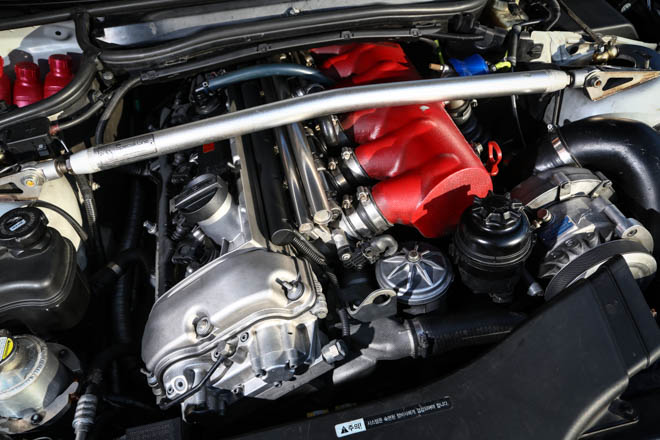 その証拠に、これ程のチューニング施しているにも関わらず、ミッションはM3純正のSMG。日本では壊れやすいというイメージのSMGだけに、大丈夫なのかと心配して聞いたところ、「きちんとオイルの管理をして、正しく乗ってやれば心配ない」とのこと。また、サーキットを全開で攻めているにも関わらず、今まで大きなトラブルになったことはないという。