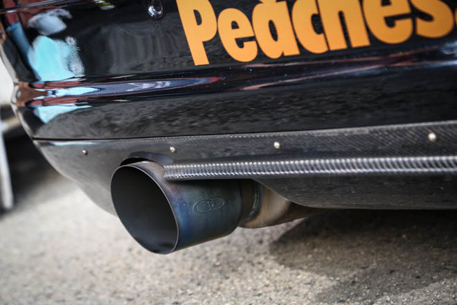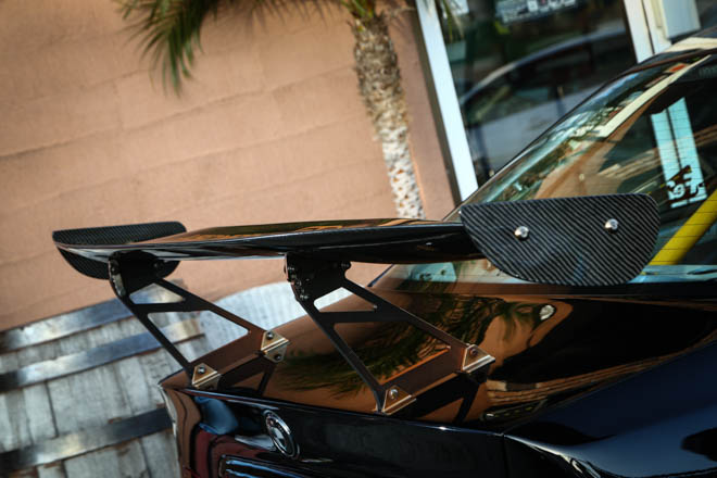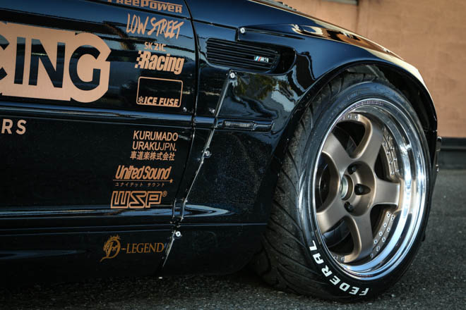 見てもらえばわかる通り、レーシングカーがそのままサーキットを飛び出してきたかのような外観で、ロケットバニーのオーバーフェンダーとGTウイング、そして、R34GT-R用を加工したというマフラーがその本気度を物語る。