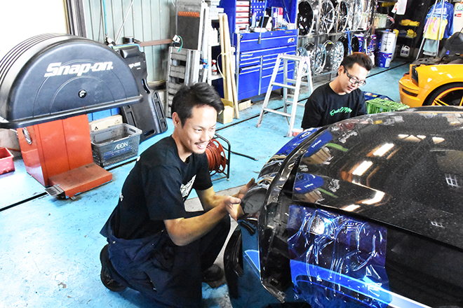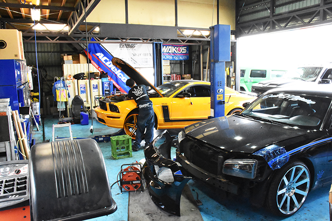 店舗にはカスタマイズが施されたアメ車がずらりと並び、ピットには整備中の車、カスタム施行中の車が常に入庫中だ。メカニックが忙しそうに作業する姿が目に入る。