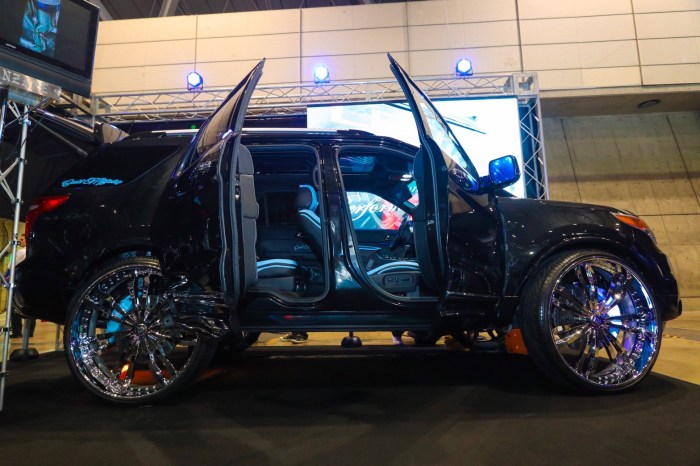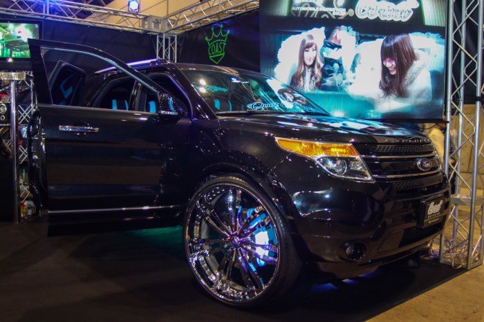 そんな濃いアメ車の中の一台がとあるブースが西館ホール1で異彩を放っていた。30インチのレクサーニホイールに430mmのビッグローターがインストールされたエクスプローラーが否応無しに目にとまった。国内でここまでカスタマイズされている現行エクスプローラーはなかなか見かけないだろう。
