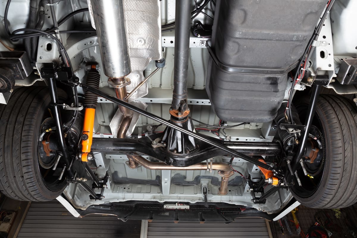 フロントはロアアームを専用パーツに交換し、そこにエアバックをセット。ショックは純正をそのまま装着することもできるし、撮影車両のようにアフターのショックブソーバに変更することもできる。そのため乗り心地もスポイルすることがなく、自分にあった足回りにセットアップすることができるわけだ。