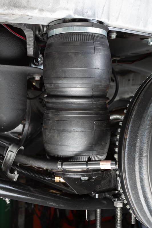 リアのエアバッグはダブル方式を採用しているので、片側3tの荷重設定。縦に伸びていくエアバックを採用しているので好みのショックを装着することができる。