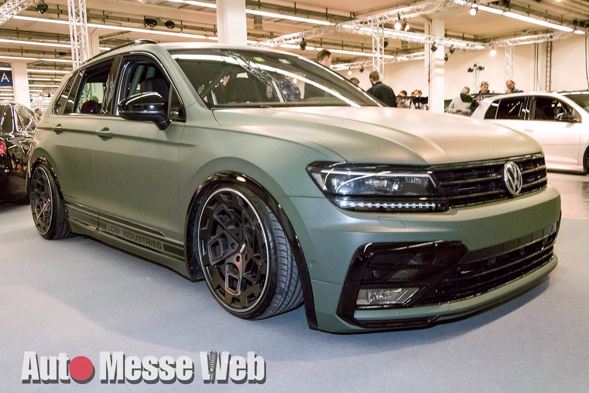 ボディはオリーブドラブ、クローム部分はすべてピアノブラックで共にラッピングしたVWティグアン。「ラディエイト r8cm9」の10J×20インチサイズを、エアサス「HPSエアライド」で飲み込んでます。SUVもスラムドすればいい感じですね。