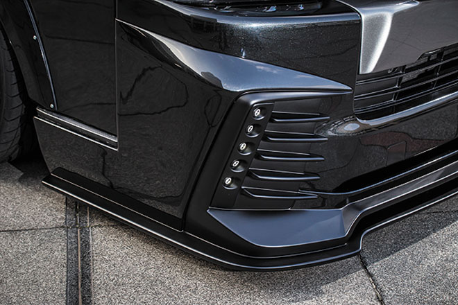 超立体的なボトム&コーナー処理がポイントで、縦5 連のLED デイライトをブチ込んだコの字型のコーナーパーツがアピール度満点。左右への張り出しがワイド感をさらに強調!!